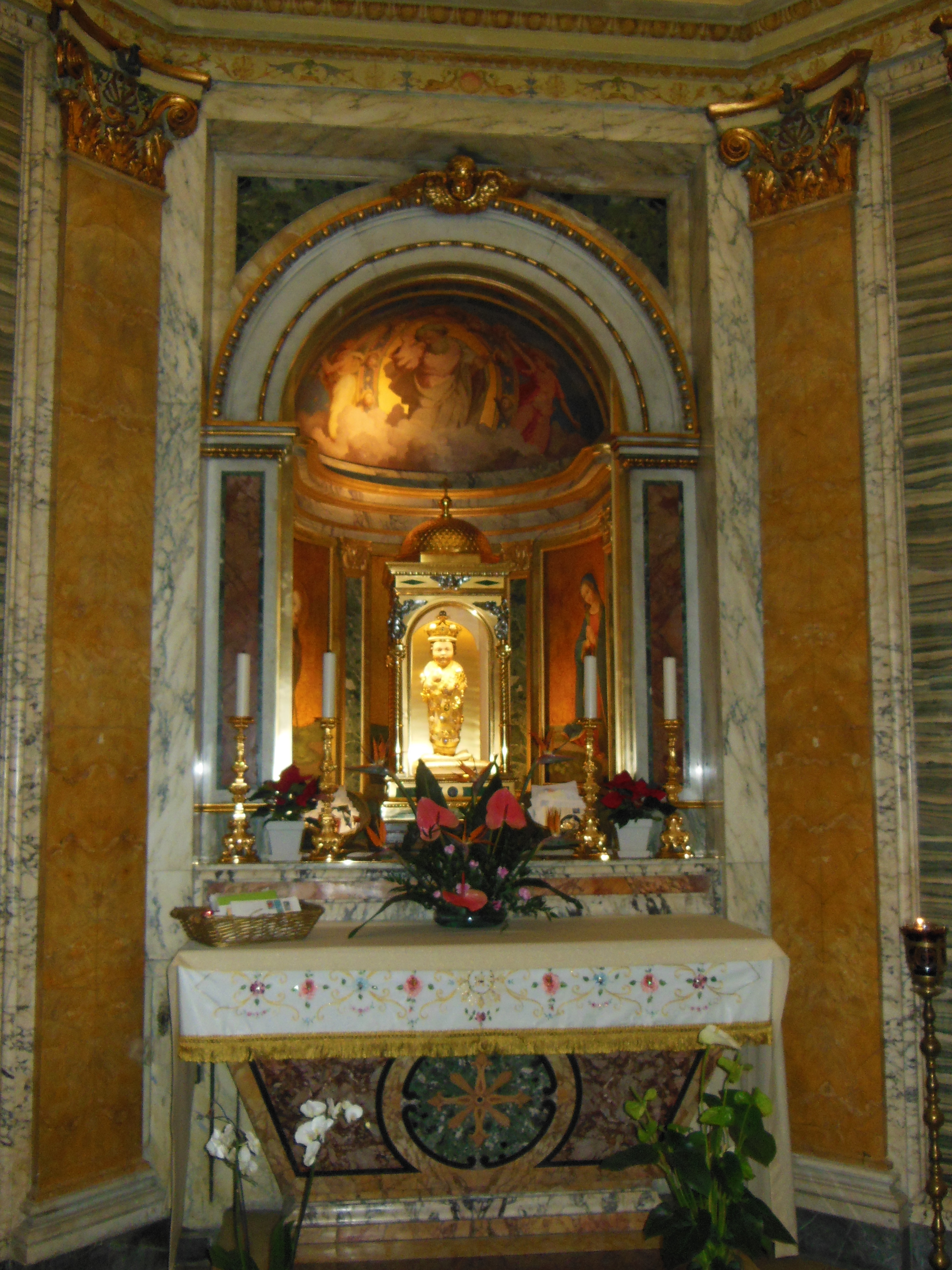 Nella cappella, in fondo a sinistra, il Bambino di Aracoeli. Fu scolpito a Gerusalemme da un frate Francescano nel XV secolo, su legno d’ulivo. Poiché il frate non avendo le tinte necessarie per completare il lavoro, l’opera fu portata a termine da un angelo. Nel viaggio verso Roma la nave incappò in una furiosa tempesta e il frate fu costretto a gettare in mare la statua (altri dicono che la nave naufragò), ma il Bambino giunge da sola al porto di Livorno.