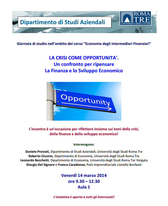 La Finanza e lo Sviluppo Economico. L’incontro è un’occasione per riflettere insieme sui temi della crisi,
