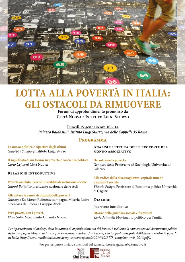 LOTTA ALLA POVERTA’: GLI OSTACOLI DA RIMUOVERE Forum di approfondimento promosso da Città Nuova e Istituto Luigi Sturzo Lunedì 19 gennaio ore 10 Condividi: Condividi su X (Si apre in una nuova finestra) X Condividi su Facebook (Si apre in una nuova finestra) Facebook Mi piace Caricamento... Lascia un commento Cancella risposta Δ