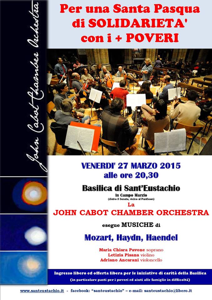 Cari Amici, la JOHN CABOT CHAMBER ORCHESTRA a Sant’Eustachio VENERDI’ 27 MARZO alle ore 20,30, sotto la direzione artistica e la preparazione musicale di Giorgia Franceschi. L’associazione John Cabot Chamber Orchestra nata nel 2005 con l’intento di creare a Roma un’orchestra aperta a musicisti non solamente di professione, di tutte le età, di tante nazionalità e di diverse esperienze e formazioni musicali,eseguirà musiche di Mozart, Haydn, Haendel.