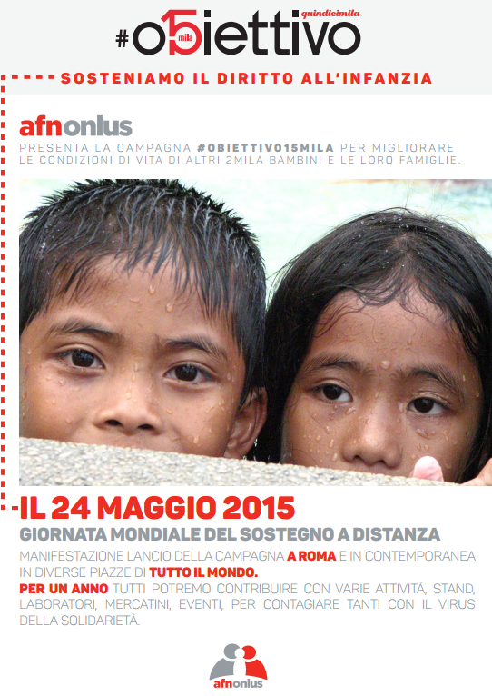 Domenica 24 maggio 2015 alla Giornata mondiale del Sostegno a Distanza, AFNonlus e il Movimento Famiglie Nuove lanceranno la campagna di sensibilizzazione e raccolta fondi #obiettivo15mila, per incrementare l’impegno concreto in favore dell’infanzia svantaggiata nel mondo: in particolare attuando interventi specifici nei confronti di altri 2mila bambini e delle loro famiglie, a partire dai 13mila già inseriti nei programmi di sostegno a distanza di AFNonlus.