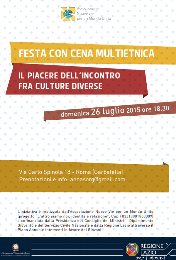 Ore 20,30 cena multietnica a buffet con musica dal mondo