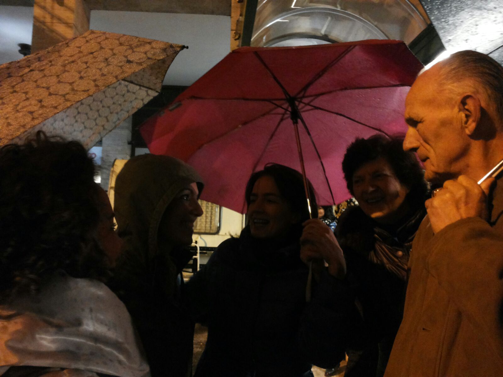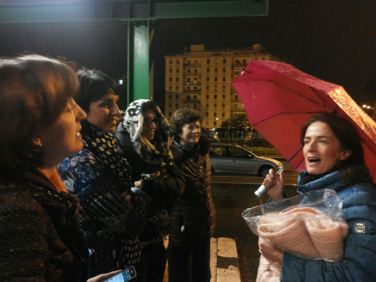 Tanta era la gente comune che passava di li e si fermava incuriosita: professionisti, tanti medici colleghi di Antonia che arrivavano con il loro dono! La macchina di Antonia e di una collega erano strapiene di coperte e capi di vestiario raccolti in settimana. Poi, quando erano state consegnate tutte, ecco che arriva Giorgia con altre 30 coperte… Insomma, nonostante la pioggia e il fatto che questa volta eravamo relegati, dietro direttive dei militari li presenti, in un angolo per via della sicurezza, eravamo circa 300 ed era collegata con noi anche la comunità locale di Clusone-BG che con la presenza di loro tre rappresentanti aveva mandato 15 coperte).