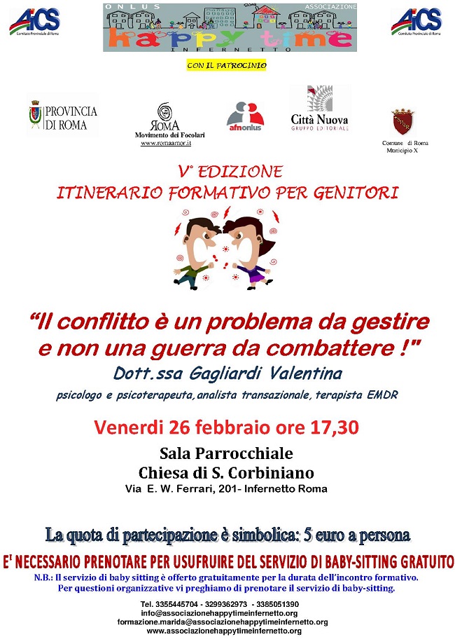 Ecco a voi il prossimo evento formativo per genitori proposto dall’Associazione Happy Time Infernetto onlus che si terrà Venerdì 26 febbraio alle ore 17,30 presso la Sala Parrocchiale di San Corbiniano.