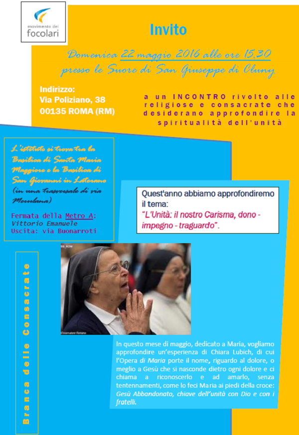 Domenica 22 maggio 2016 alle ore 15.30 presso le Suore di San Giuseppe di Cluny, Indirizzo: Via Poliziano, 38 00135 ROMA (RM)