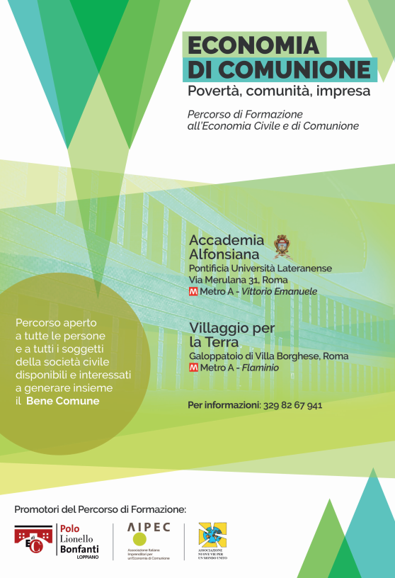 Percorso di Formazione all’Economia di Comunione, che prevede ulteriori tre eventi, che avranno luogo nei mesi di febbraio, aprile e maggio, in parte presso l’Accademia Alfonsiana di Roma e in parte presso il Villaggio per la Terra.