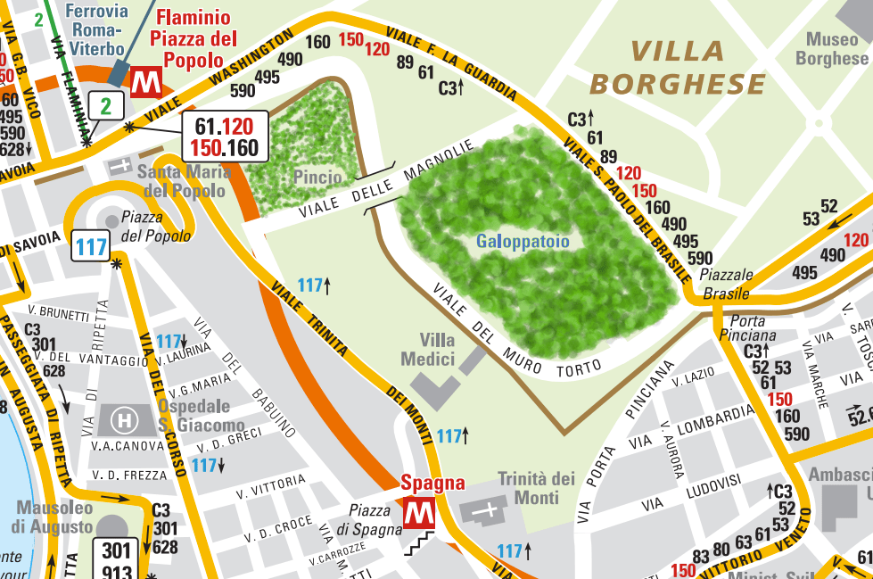 - oppure utilizzare il Parcheggio sotterraneo SABA di Villa Borghese sotto il Galoppatoio. Per info sui prezzi orari e giornalieri clicca qui, oppure per info sugli abbonamenti da più giorni clicca qui. Per arrivare al Parcheggio Sotterraneo Provenendo da ‘Corso d’Italia’ o ‘via Pinciana’ in direzione piazza del Popolo, superare l’incrocio di piazzale del Brasile e proseguire lungo via del muro torto; la strada fa subito una curva, a metà della curva la strada si divide, mantenere la destra su viale del galoppatoio, la strada si ridivide ancora e bisogna sempre mantenere la destra. Seguire le indicazioni per il parcheggio sotterraneo.