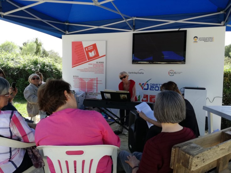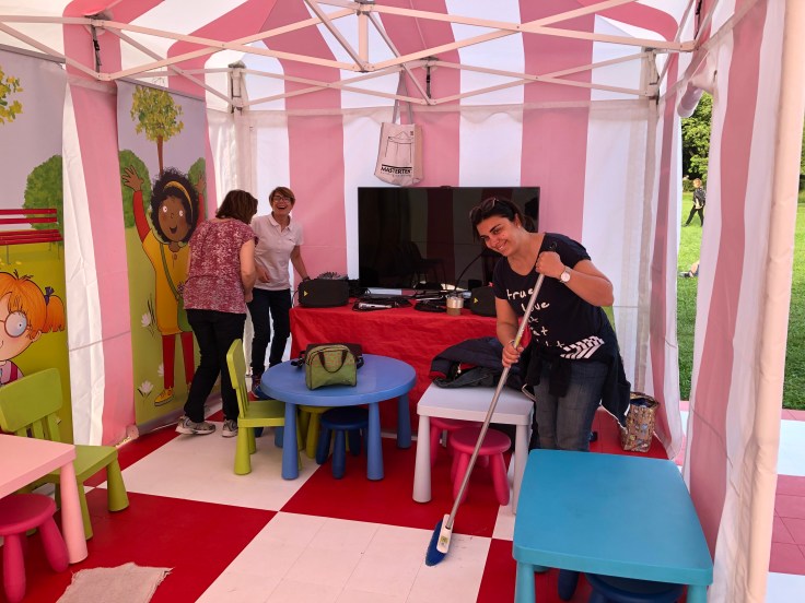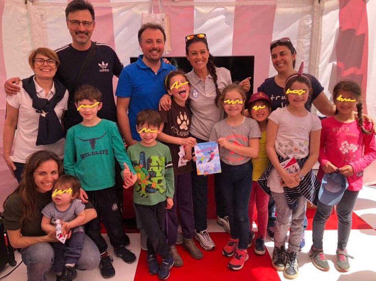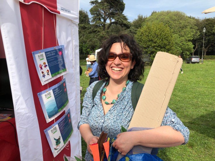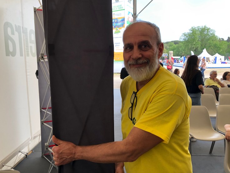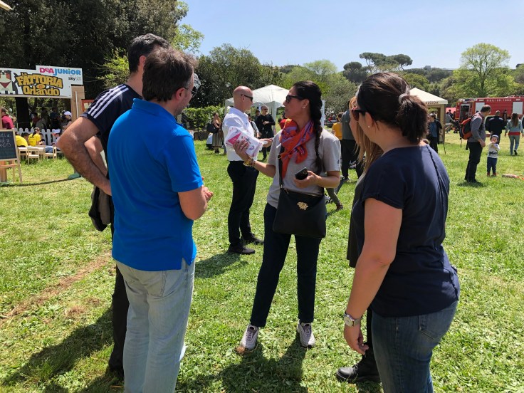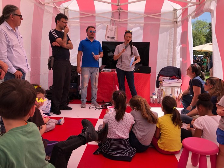 Durante il giro del Villaggio ritroviamo alla Tenda dei Bambini Daniele Diaco, Presidente della Commissione Capitolina Ambiente accompagnato da Antonia Testa. Lo accolgono Maria e Lorenzo Russo
