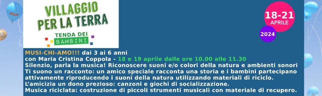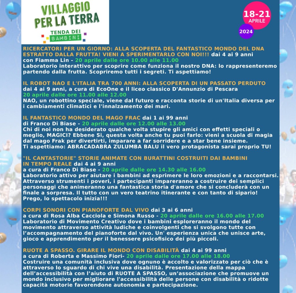 Alcuni Eventi del Villaggio per la Terra 2024 Giovedi 18 Aprile 2024 Venerdi 19 aprile 2024 Sabato 20 aprile 2024 Domenica 21 Aprile 2024 Condividi: Fai clic per condividere su X (Si apre in una nuova finestra) X Fai clic per condividere su Facebook (Si apre in una nuova finestra) Facebook Mi piace Caricamento... I commenti sono chiusi.