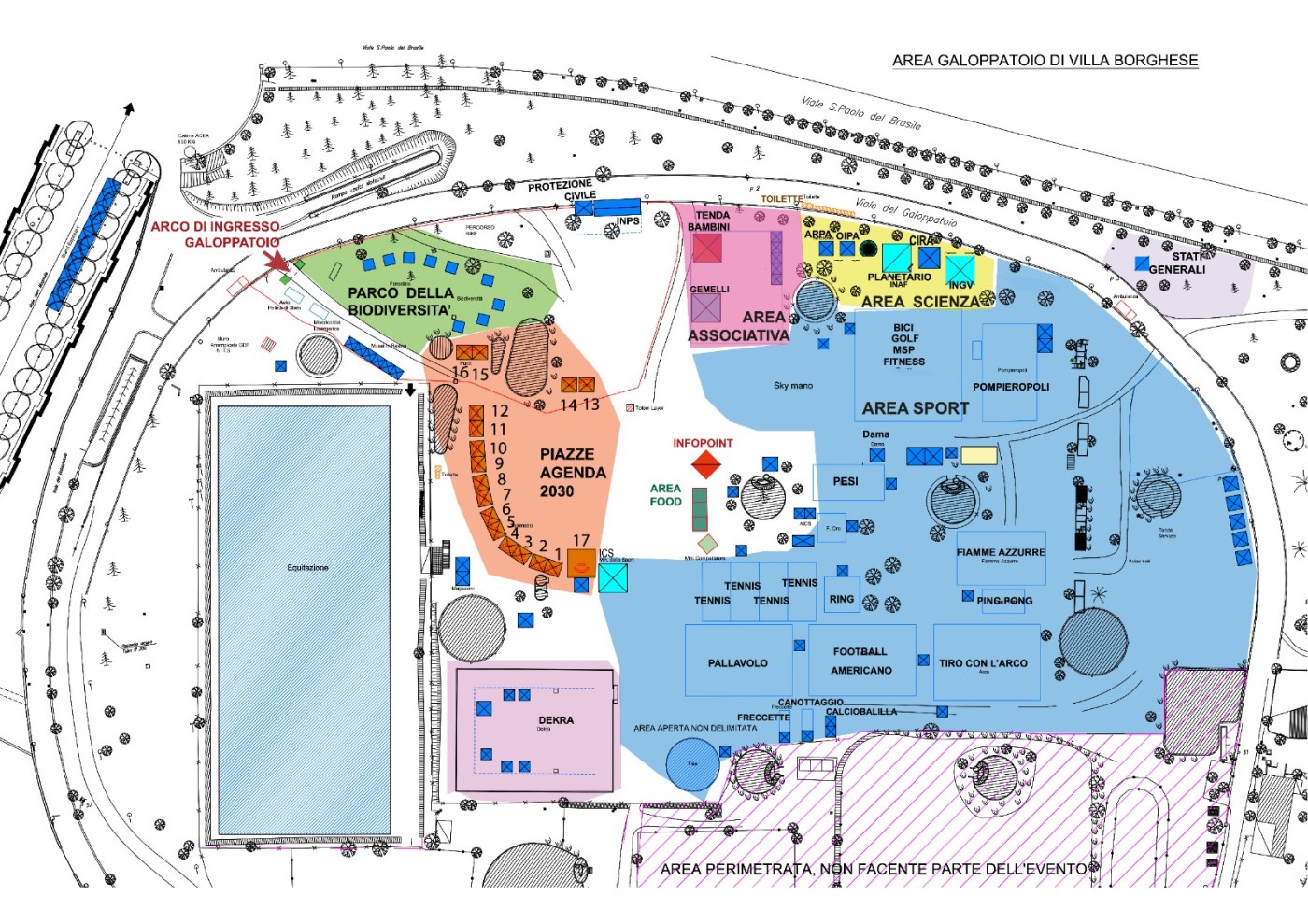 L’area del Galoppatoio sarà idealmente suddivisa in 5 aree: l’Area Sport, l’Area Associativa, L’Area Scienza, Le Piazze Agenda 2030, Il parco della Biodiversità, secondo la mappa che segue e che si può scaricare a questo link