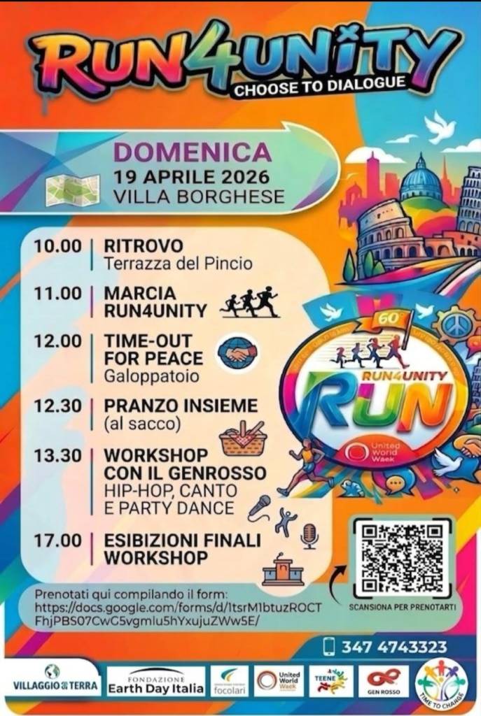La RUN4UNITY a Roma sarร domenica 19 aprile dalle 10 alle 18 al Villaggio per la Terra a Villa Borghese.